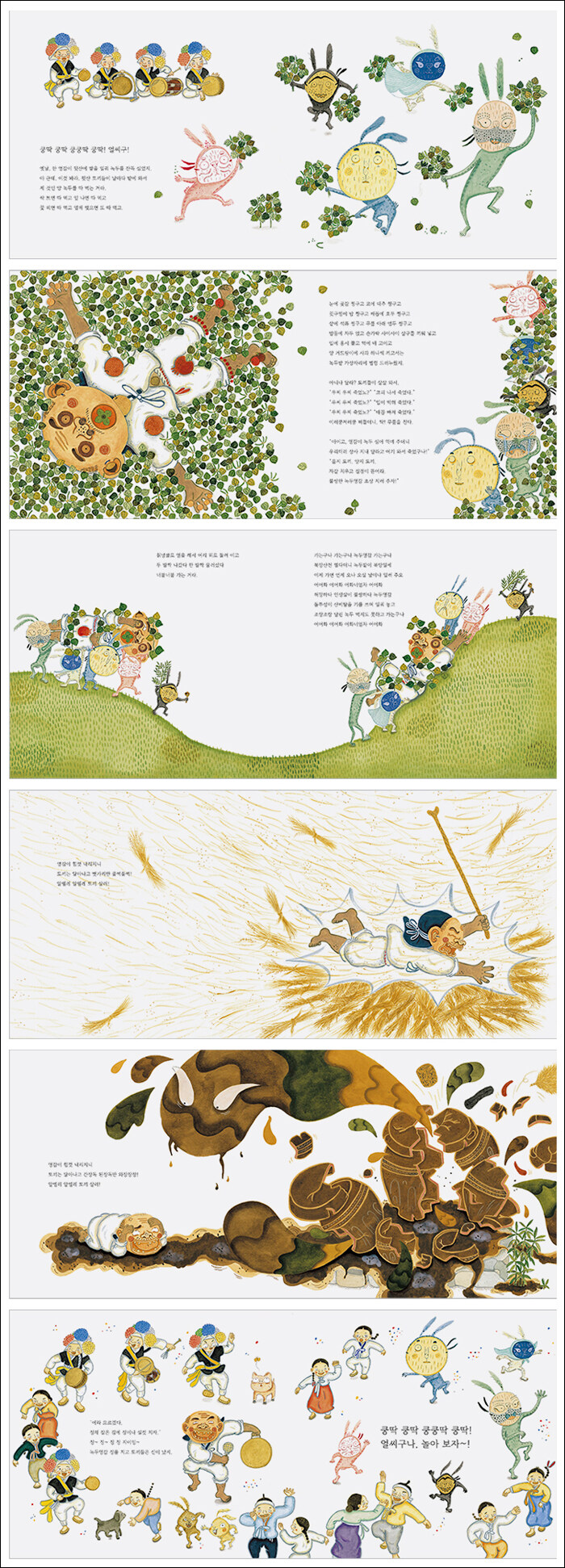 화해의 춤판으로 끝난 치열한 싸움‘에라 모르겠다. 징채 잡은 김에 징이나 실컷 치자.’ 엎어진 김에 잠잔다고, 녹두영감 풍물패의 징을 받아들고 징을 칩니다. 징~ 징~ 징 징 지이잉~! 그 소리에 모두들 신이 나지요. 영감도 토끼들도 구경꾼들도. 쿵딱 쿵딱 쿵쿵딱 쿵딱! 얼씨구나, 놀아 보자~! 죽을 똥 살 똥 달려들던 싸움은 끝나고, 한바탕 춤판이 벌어집니다. 언제 싸웠느냐는 듯 하나로 어우러진 신명나는 춤판입니다. 한참을 놀고 난 뒤, 벗어놓은 탈들 위로 징소리 퍼져가고, 그렇게 이야기가 끝났습니다. 그림책도 끝이 났습니다.