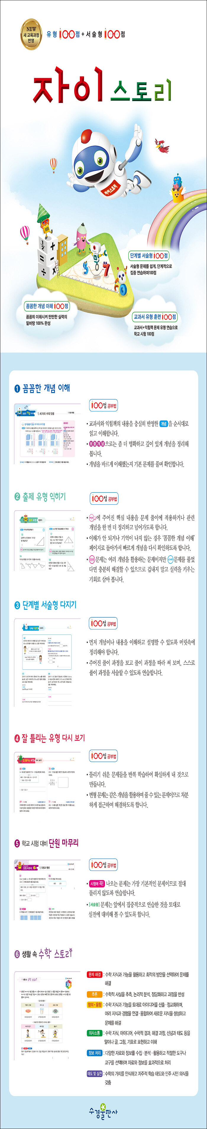 세분화된 유형 문제로 교과 개념을 탄탄하게 완성하고, 서술형 문제를 쉽게 해결하는 단계적 방법을 터득하고, 잘 틀리는 문제는 집중 반복 학습하는 체계적 시스템의 《초등 자이스토리 수학》 시리즈와 함께라면 학교 시험 100점은 물론 수학에 대한 자신감을 가질 수 있습니다.