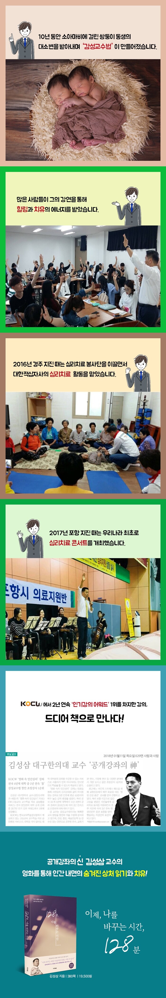 영화를 통해 나를 바꾸는 시간<아바타>부터 <명량>까지 열 편의 영화를 통해 나를 바꾸는 시간을 제공하는 책이다. 대구한의대 상담심리학과 교수인 김성삼 저자의 감성교수법은 입소문을 타면서 전국적으로 알려졌는데, 이 책의 모태가 된 ‘영화 속의 인간심리’ 강좌가 전국 대학 공개강의 사이트인 KOCW(고등교육 교수학습자료 공동활용 체제)에서 2016년, 2017년 2년 연속 그해 가장 인기 있는 강좌에 주는 ‘인기강의 어워드’ 1위를 차지했다. 드디어 김성삼 저자의 인기강의를 책으로 만난다!
