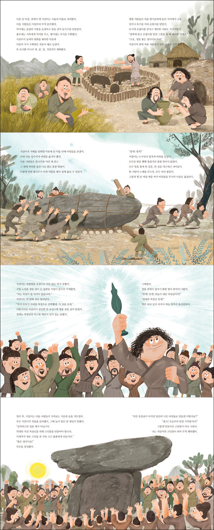 책을 쓴 강효미 작가는 강화도의 고인돌 유적지에서 본 ‘강화 부근리 지석묘’를 소재로 청동기 시대의 작은 마을을 떠올렸습니다. 그리고 이 고인돌에 생명을 불어넣어 수천 년 전 청동기 시대의 이야기를 생생하게 들려주도록 했지요.