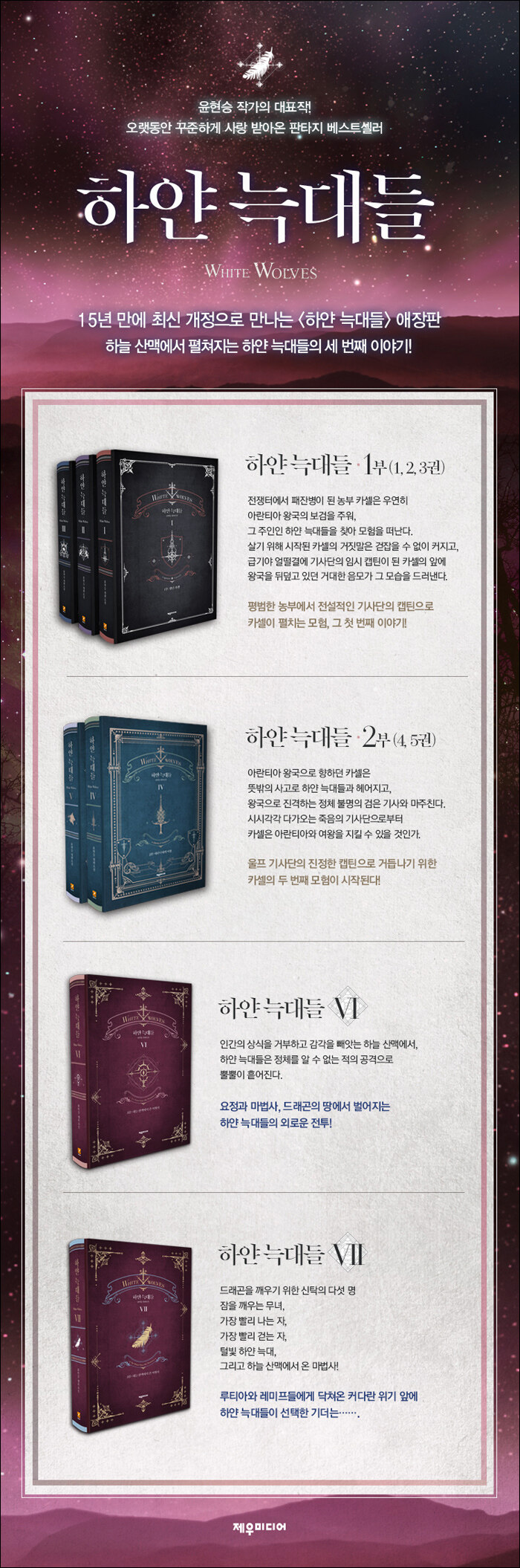 윤현승 작가의 대표작《하얀 늑대들》최신 개정판!《하얀 늑대들》은 2003년 처음 출간된 이후 폭발적인 인기를 끌어온 작품으로, 15년이 지난 지금까지도 전자책으로 베스트셀러에 올라있을 만큼 한국 판타지 독자들에게 사랑을 받고 있는 명작이기도 하다.