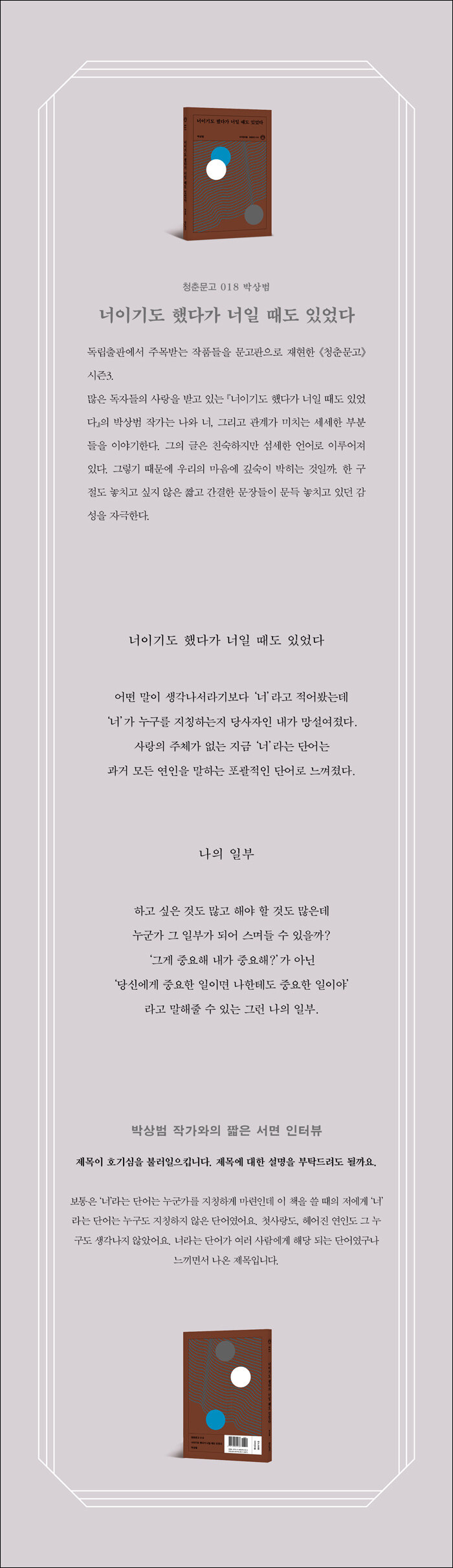 독립출판에서 주목받는 작품들을 문고판으로 재현한 《청춘문고》 시즌3 18권. 많은 독자들의 사랑을 받고 있는 『너이기도 했다가 너일 때도 있었다』의 박상범 작가는 나와 너, 그리고 관계가 미치는 세세한 부분들을 이야기한다. 그의 글은 친숙하지만 섬세한 언어로 이루어져 있다.