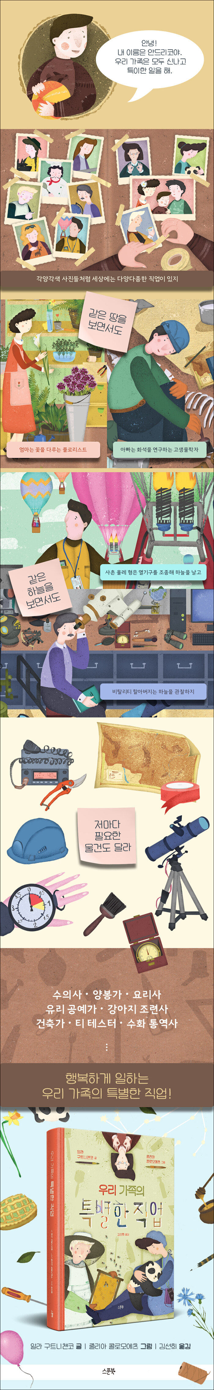 우리 가족은 특별한 직업을 가졌어요!고생물학자에 대해서 들어 봤니? 우리 아빠는 고생물학자야. 고생물학자가 뭐 하는 사람인지 잘 모르는 친구들도 있겠지만, 이렇게 말하면 감이 올 거야. 오래전에 지구에 살았지만 지금은 멸종된 식물이나 동물, 그러니까 공룡 같은 거 말이야, 그렇게 오래전에 죽은 생물의 화석을 발견해서 연구를 한단다. 그렇다면 플로리스트는 어때? 우리 엄마는 아름다운 꽃을 다루는 플로리스트거든. 플로리스트는 상상력도 풍부하고, 색에 대한 감각도 남달라야 해. 꽃의 특성도 잘 알아야 하는 건 기본이고 말이야. 그래야 사람들이 원하는 예쁜 꽃다발을 만들 수 있단다. 우리 누나의 직업은 뭘까? 바로 수의사야. 누나의 주요 일과 중 하나는 바로 판다를 안아주는 거야. 세상에 이렇게 멋진 일이 또 있을까?