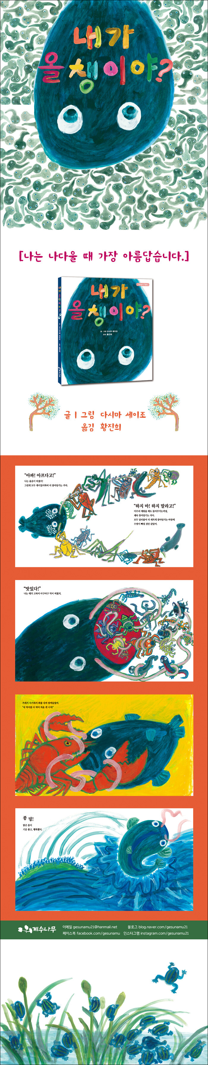 내용 소개 나는 들판의 작은 연못에 살고 있는 올챙이입니다. 시간이 지나 형제들은 모두 개구리가 되어 연못을 떠났지만, 나만 여전히 그대로입니다. 연못에 사는 다른 친구들은 긴 수염이 자란 내 모습을 보고 비웃었어요. 나는 괴롭히는 녀석들에게 맞서다가 얼떨결에 모두 다 먹어 버리고 말았어요. 먹이를 빼앗겨서 화가 난 가재까지도 먹어 치웠지요. 뭐든 가리지 않고 다 먹은 탓에 어느새 내 몸은 연못만큼 커졌어요. 그때, 형제들이 다가와 내 정체를 가르쳐 주었어요. 힘을 합쳐 나를 강으로 데려다 준 형제들은 눈물을 흘리며 손을 흔들어 주었지요. 나는 힘껏 소리쳤어요. “고마워! 형제들아!”