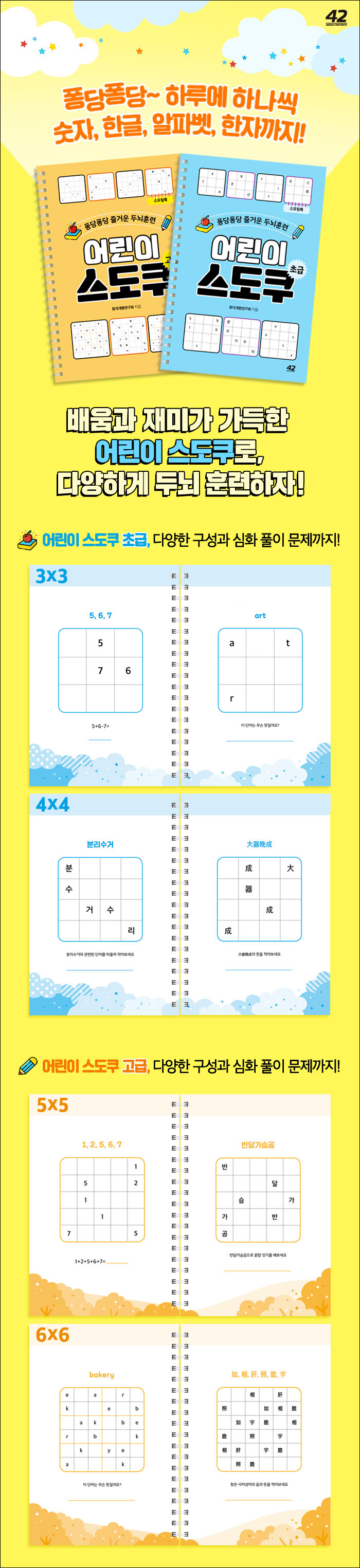 가장 쉬운 3×3 9칸부터 조금 어려운 4×4 16칸으로 구성되어 있다. 숫자, 한글, 알파벳, 한자 등 다양한 문제로 구성되어 있어 아이들의 IQ(지능지수) 뿐만 아니라 EQ(감성지수)까지 기를 수 있도록 했다. 3×3 9칸의 쉬운 문제부터 4×4 16칸의 비교적 어려운 문제까지 풀어나가는 동안 아이들은 스스로 움직이고 한 번 더 생각하고 조금 더 노력하며 한 뼘 더 성장하는 기회를 갖게 될 것이다.
