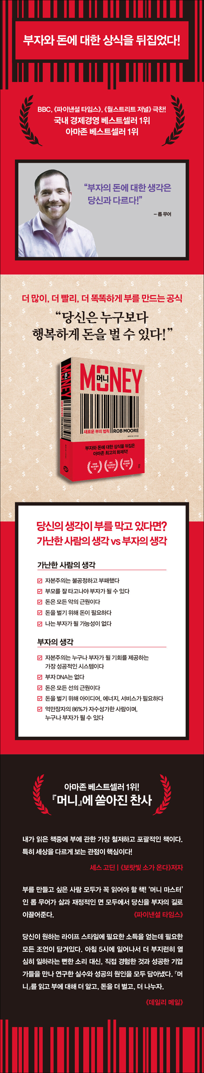 롭 무어는 5만 파운드의 빚더미를 안고 파산 직전에서 3년 만에 백만장자로 거듭나면서 부를 끌어당기는 메커니즘을 직접 경험하고, 억만장자와 성공한 기업가들을 수없이 만나며 그들이 공통적으로 가진 핵심 요소를 연구했다. 그는 『머니』에서 어떤 생각과 태도가 당신이 이룰 수 있는 부를 막고 있는지 파헤치고, 부와 돈에 대한 편견을 뒤집는다. 나아가 부의 정의, 목적, 역사, 흐름, 시스템, 자연적·경제적 법칙을 알고 ‘가장 빨리, 가장 현실적인 시간 안에 부를 증식시키는’ 모든 방법을 공개한다.