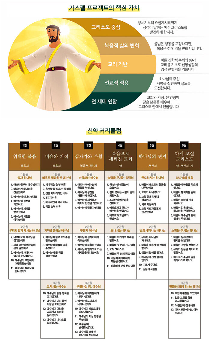 [가스펠 프로젝트 고학년 교사용 교재의 특징]● 연대기 성경 공부 교재연대기적 큰 흐름 속에서 성경의 메시지를 배웁니다.