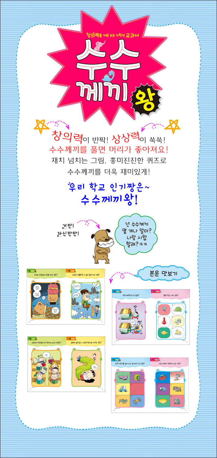 재치 넘치는 그림, 흥미진진한 퀴즈로 수수께끼를 더욱 재미있게!아무리 재미있는 수수께끼라도 계속 문제만 풀면 싫증이 나겠지요? 그래서 이 책에는 수수께끼마다 재미있는 그림을 곁들였어요. 수수께끼가 조금 어렵게 느껴질 때 그림을 보면 수수께끼의 답을 쉽게 유추해 낼 수 있답니다.