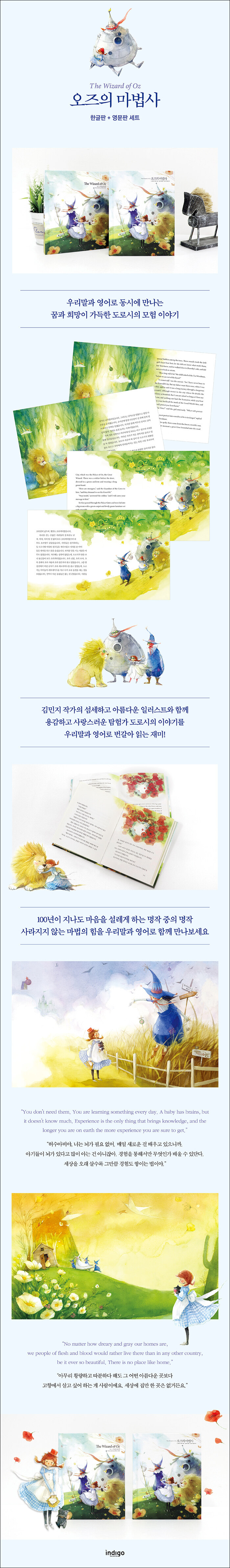 한글판과 영문판을 오가며 읽는 즐거움!1900년 발표된 이후 100년이 넘는 시간 동안 독자들의 많은 사랑을 받아온 세계적인 아동문학 명작 《오즈의 마법사》 한글판과 영문판 세트가 출간되었다. 다정하고 호기심 많은 모험가 도로시가 허수아비, 사자, 양철 나무꾼과 함께 마법의 세계 오즈를 탐험하는 신비로운 이야기를 우리말과 영어로 동시에 만날 수 있다. 《어린 왕자》《이상한 나라의 앨리스》《피터 팬》 등으로 탄탄한 팬층을 확보한 김민지 작가의 아름답고 섬세한 일러스트가 소장 가치를 더한다. 한글판으로 먼저 내용과 줄거리를 이해하고 영문판으로 다시 읽어가다 보면 어느새 꿈과 희망이 가득한 도로시의 모험 이야기에 푹 빠져들게 될 것이다.