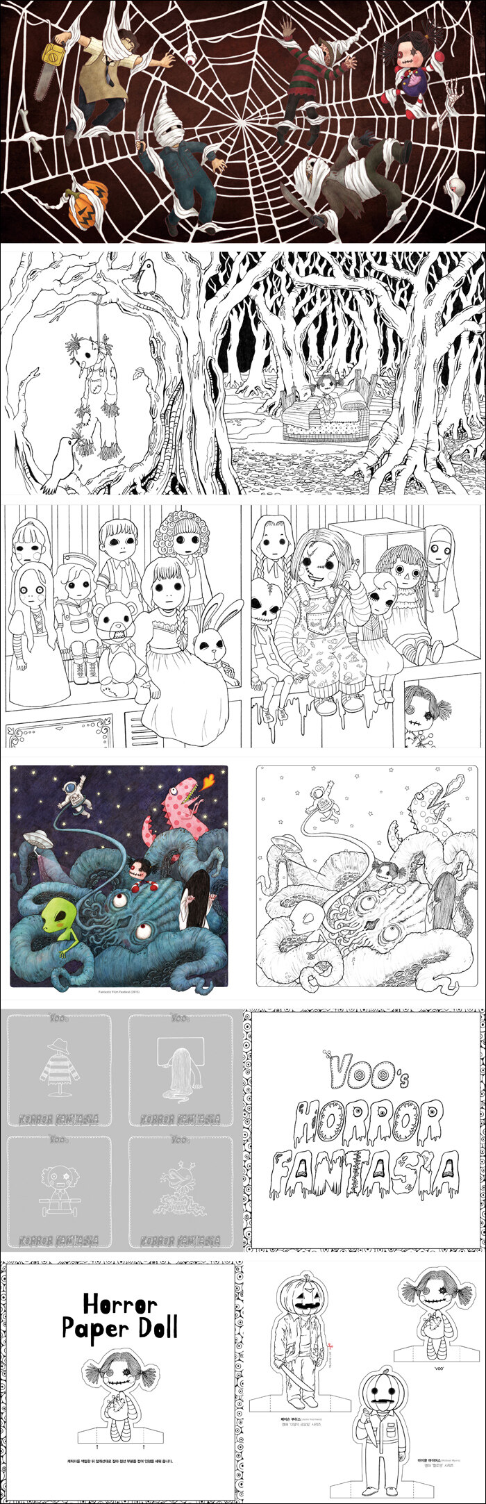 《Voo’s 호러판타지아》로 여러분은 불안하고 위축된 마음에 평화를, 일상의 권태에 창조적인 마법의 불을 붙여라. 당신을 화나게 한 사람을 욕하지 말고 이 책에 그 분노를 물들여라. 좀비, 뱀파이어, 부두 인형, 연쇄살인마, 마법사 등 역사상 가장 위대한 공포 아이콘을 색칠하며 삶의 긴장을 푼다.
