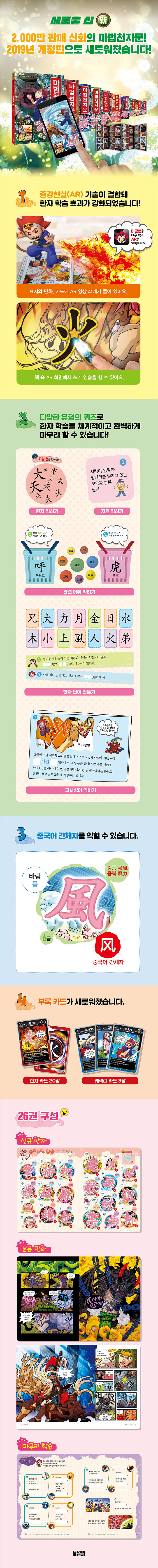 (1) 대한민국 대표 한자 학습만화가 AR 체험형 에듀 콘텐츠로 더욱 새로워졌다! 2,000만 독자가 선택한 마법천자문은 지난 15년간 한자 학습의 열풍을 일으키며 어린이들에게 큰 사랑을 받아왔습니다. 어린이들은 재미있는 이야기를 읽으면서 한자 마법을 반복하다 보면 어느새 신규한자 20자가 머리 속에 각인됩니다. 권수를 더해 갈수록 저절로 암기되는 한자의 양은 늘어나고, 한자 낱자 두 개를 붙여 만드는 단어마법과 한 개의 낱자를 다양한 낱자들과 합쳐 확장하는 단어확장마법까지 읽고 나면 어휘능력도 부쩍 향상됩니다.