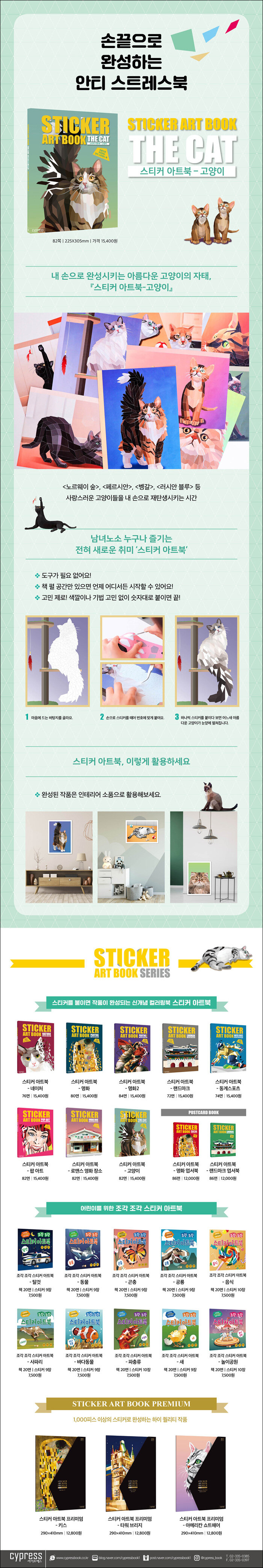 번호에 맞는 스티커를 붙여 나만의 작품을 완성하는『스티커 아트북』시리즈의 열 번째 책『스티커 아트북-고양이』편이 출간됐다.『스티커 아트북-고양이』에서는 검은 고양이 네로로 유명한 <봄베이>, 아몬드 모양의 에메랄드빛 눈으로 전 세계의 사랑을 한 몸에 받고 있는 <샴>, 신비함이 느껴지는 초록색 눈동자와 은회색 털을 가진 <러시안 블루>, 세상에서 가장 완벽한 고양이라는 평을 듣는 <래그돌>, 야생성이 강하기로 유명한 <벵갈>, 보통 고양이를 떠올렸을 때 생각나는 회색 줄무늬 고양이 <아메리칸 쇼트헤어>, 고양이의 귀부인이라고 불리는 <페르시안>, 일상 어디에서나 발견할 수 있는 <한국 고양이>, 몸에 비해 귀가 커 귀여움이 배가 되는 <아비시니안>, 북유럽의 추위도 견딜 수 있는 <노르웨이 숲>까지 고양이를 생각하면 떠오르는 대표 고양이 10종을 소개한다. 유튜브나 SNS에서 볼 수 있던 고양이를 이제 내 손으로 완성시키는 즐거움을 만끽해보자.