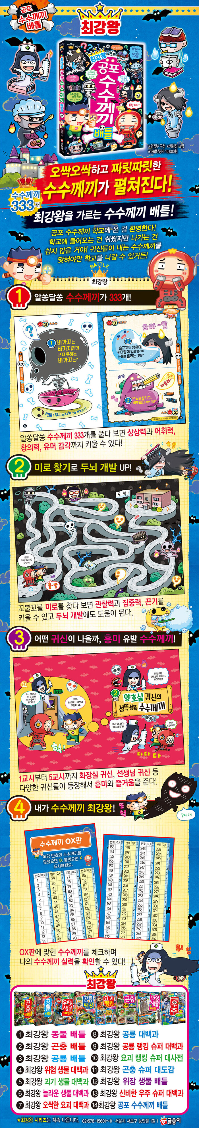오싹오싹하고 짜릿짜릿한 수수께끼가 펼쳐진다!알쏭달쏭한 수수께끼가 333개! 수수께끼를 풀다 보면 상상력과 어휘력, 창의력, 유머 감각 등을 키울 수 있다. 수수께끼를 풀고 미로를 찾다 보면 관찰력과 집중력, 끈기를 키울 수 있고 두뇌 개발에도 도움이 된다. 특히 공포 학교를 배경으로 1교시부터 5교시까지 화장실 귀신, 양호실 귀신, 선생님 귀신, 도서관 귀신 등 다양한 귀신들이 등장해 수수께끼를 푸는 흥미와 즐거움이 배가 된다. 수수께끼 OX판에 맞힌 수수께끼를 체크하며 수수께끼 실력도 확인할 수 있다.