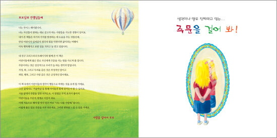 긍정의 힘을 어린이에게 선물하세요어린이들이 주문을 거는 가장 간단한 방법은 거울을 통해서다. 어린이들은 거울 앞에서 주문을 걸 수 있다. 주문이라는 것은 일상적으로 우리가 늘 하는 생각과 말이다. 걱정, 화, 그리고 두려움 같은 것은 부정적인 말이고 희망, 행복, 그리고 사랑 같은 것은 긍정적인 말이다. 어린이들은 “나는 나를 사랑해.”와 같은 좋은 말을 통해 부정적인 생각을 걷어내고 긍정적인 생활을 할 수 있다.