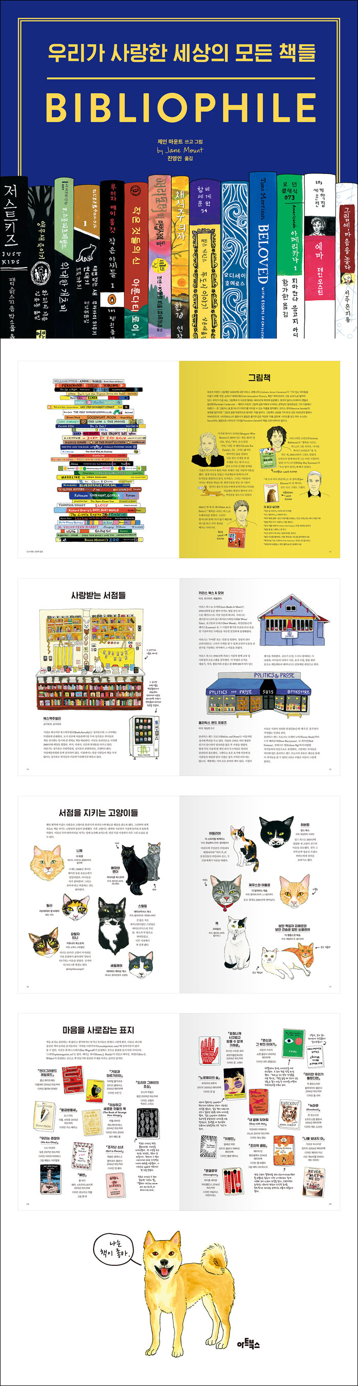 책과 서점이 있는 풍경책은 ‘우리가 사랑한 책들’ ‘사랑받는 서점들’ ‘장르별 책 소개’와 같은 커다란 줄기를 바탕으로 ‘가보고 싶은 도서관’ ‘작가의 방’ ‘작가와 반려동물’ ‘세계를 바꾸는 독서인’처럼 책을 둘러싼 장소, 사람, 동물 이야기가 가지처럼 뻗어 있다. 그중 19세기부터 21세기에 이르는 고전문학과 소설의 발전 과정을 돌아보고 주제별로 소개된 책 표지를 보고 있노라면, 내가 갖고 있거나 보고 싶은 책이 다른 곳에서는 어떤 모습으로 출간되었는지 확인하는 재미가 쏠쏠하다. 이뿐 아니라 세계 각지에 있는 서점과 도서관을 살펴보는 것 또한 흥미롭다. 특히 작가들이 직접 운영하는 서점과 특정 지역의 사랑방이자 문학의 아지트로 자리매김한 장소들은 언젠가 떠날 여행에서의 체크 리스트 맨 위를 차지할 만큼 매력적인 목적지로 손색이 없다.