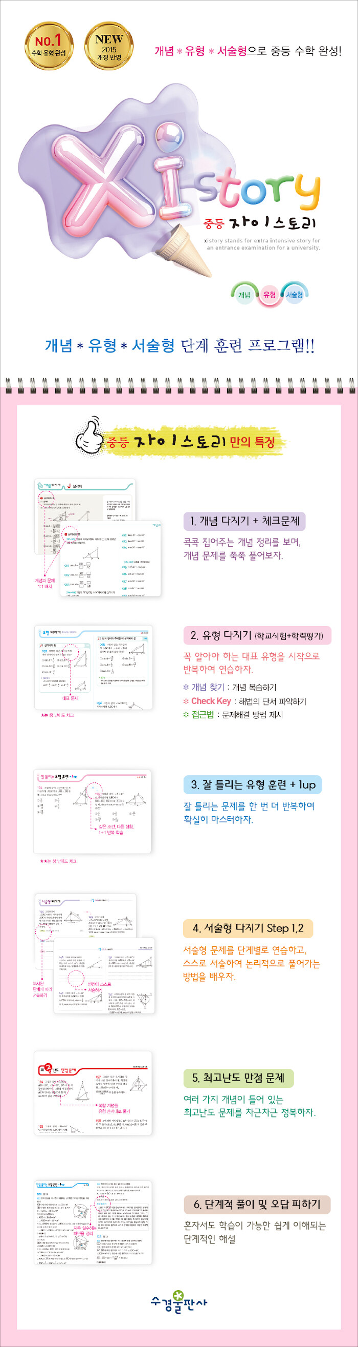 수학 문제는 개념 부족, 계산 착오, 유형 미숙 등의 이유로 틀리지만, 늘 틀리는 문제를 또 틀린다. 자이스토리는 쉽게 이해되도록 개념과 유형을 촘촘히 쪼개고, 또 잘 틀리는 문제들을 모아서 1: 1로 반복 훈련하게 구성했다. 서술형 문제는 [먼저], [그다음], [그래서]의 연결어로 단계 훈련을 하도록 해 쉽게 접근하여 쉽게 풀어낼 수 있도록 하였다.