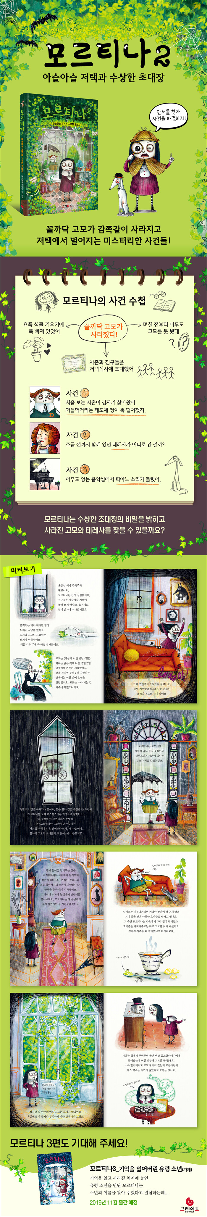 사랑스러운 좀비 소녀가 미스터리한 사건과 함께 돌아왔어요마을 아이들과 친구가 되고 싶어 하던 좀비 소녀, 모르티나가 두 번째 이야기로 찾아왔어요. 1편에서 아이들은 모르티나가 진짜 좀비라는 걸 알고 멋진 친구가 생겼다며 기뻐했어요. 그리고 모르티나와 아슬아슬 저택에 대한 비밀을 지키기로 약속했죠.