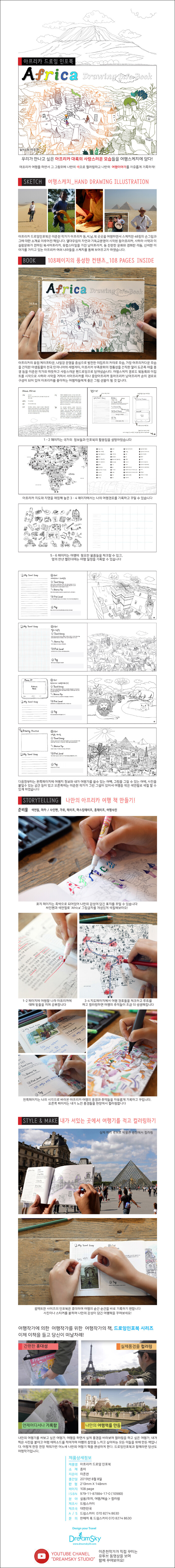 우리가 만나고 싶은 아프리카 대륙의 사랑스러운 모습들을 여행스케치로 담아내다.아프리카 드로잉인포북은 이준천 작가가 아프리카 동,서,남,북 곳곳을 여행하면서 스케치한 48장의 손그림과 그에 대한 소개로 이루어진 책이다. 열대우림의 자연과 기독교문명이 시작된 동아프리카, 사하라 사막과 이슬람문화가 전파된 북서아프리카, 유럽스타일을 가진 남아프리카, 등 찬란한 문화와 경쾌한 리듬, 신비한 이야기를 가지고 있는 아프리카 여러 나라들을 스케치를 통해 보여주고자 하였다. 아프리카의 유럽 케이프타운, 나일강 문명을 중심으로 발전한 이집트의 카이로 모습, 가장 아프리카다운 모습을 간직한 야생동물의 천국 탄자니아의 세렝게티, 아프리카 부족문화의 정통성을 간직한 말리 도곤족 마을 풍경 등을 이준천 작가의 따뜻하고 사랑스러운 펜드로잉으로 담아냈다. 여행스케치 경로도 북동쪽의 이집트를 시작으로 사하라 사막을 거쳐서 서아프리카를 지나 중앙아프리카 동아프리카 남아프리카 순의 경로로 구성이 되어 있어 아프리카를 좋아하는 여행자들에게 좋은 그림 선물이 될 것 이다.