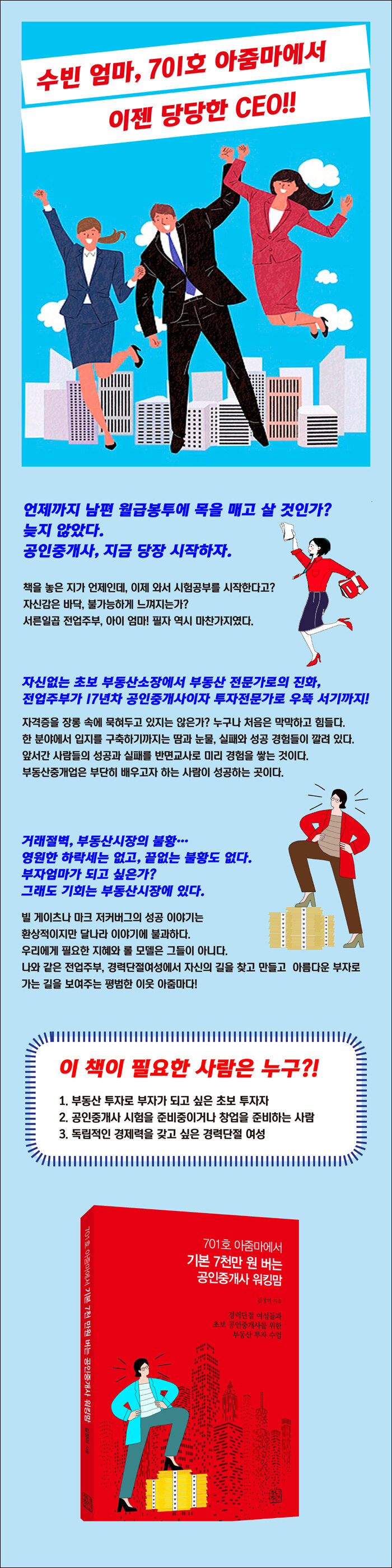 서른일곱에 처음으로 부동산중개사 자격증을 따기 위해 도전하고, 서툴고 무지하고, 가정을 꾸리며 인간관계에 서툴던 필자가 부동산중개업을 천직으로 여기며 당당히 서기까지 겪었던 경험들의 엑기스다.