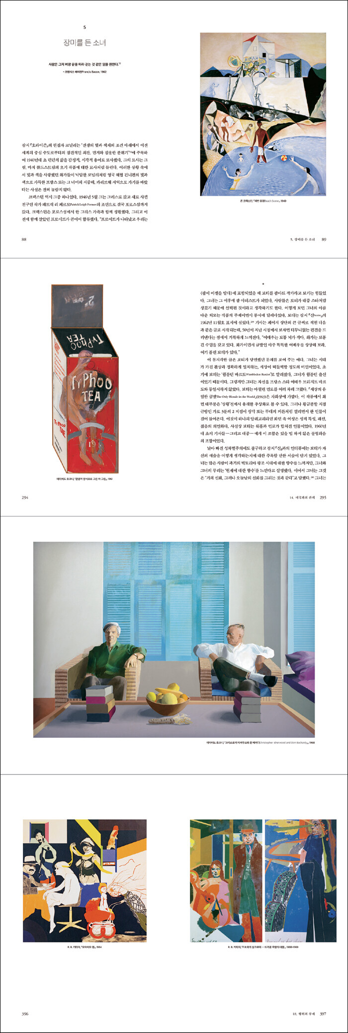 프로이트, 베이컨, 호크니 그리고 예술계를 뒤흔든 화가들지그문트 프로이트의 손자 (1932년에 독일 나치를 피해 일가가 영국으로 건너왔다) 루시안 프로이트는 모두가 추상화의 물결에 흔들리고 있을 때 ‘사실’을 그림 속에 담아내려 했다. 그는 마음속에만 존재하는 것이 아닌, 실제 존재하는 것을 그렸다(그는 “나는 내 작품이 정확한 것이 아닌, 사실을 담은 것처럼 보이길 바랍니다.”라고 말했다). 프로이트는 훗날 유럽 미술계에서 가장 뛰어난 전라 초상화가가 되었는데, 그의 그림을 보면 그가 사실을 추구하는 전통 회화의 맥을 이어 가면서도 왜 사진을 경계하거나 의식하지 않았는지 알 수 있다. 그의 그림 속에는, 사진은 결코 드러내지 못하는 ‘인물의 색’이 발산된다. 하지만 최고가 되기까지 그는 몇 십 년간 대중에게 잊힌 화가였고, 어려움 속에 살아야 했다. 그는 한때 물감으로 삼차원 입체 형태에 대한 감각을 만드는 방법을 찾기 위해 애썼다. 물감이 “살처럼 작동”하게 하는, 단지 모델을 재현하는 것이 아니라 모델을 체현하는 것처럼 보이는 방법을 찾으려 했다. 이 시기에 베이컨의 자유로운 붓놀림은 프로이트로 하여금 보다 ‘대담한’ 느낌을 갖게 해 주었다.