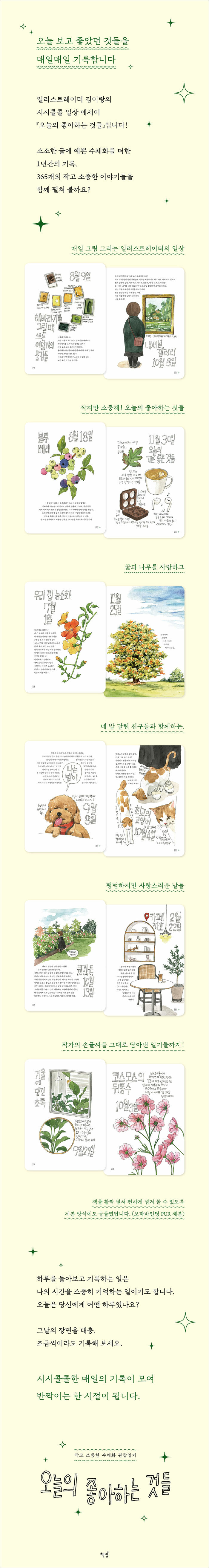 이 책은 사소한 것들을 소중히 바라볼 줄 아는 김이랑 작가의 1년간의 기록이다. 소소한 글에 예쁜 수채화를 더해 지난 1년의 나날을 365개의 일기로 기록했다. 작가가 꾸준히 실천한 '1일 1그림' 컬렉션과도 같은 책. 산책 중 발견한 작은 꽃, 그날 본 책과 영화, 잠깐 마주친 길고양이 등 별거 없는 하루의 이야기마저도 사랑스러운 그녀의 기록은 누군가에겐 신선한 자극이 되기도, 누군가에겐 기록에 대한 의지를 심어 주기도 할 것이다.