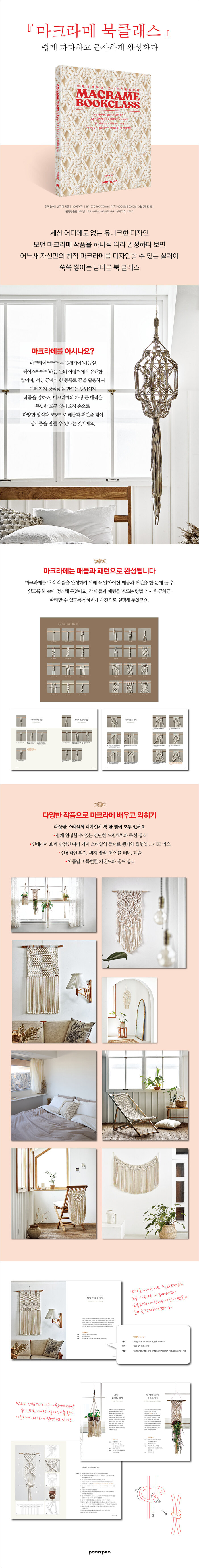 나만의 디자인 마크라메를 만들어 보아요이 책의 저자는 자신의 작품을 그대로 따라해보는 경험을 통해 독자 여러분이 스스로 디자인하는 방법을 배우기 바라는 마음입니다. 책 속에 실린 작품을 선정한 기준도 '창작'에 있습니다. 초보들이 매듭과 패턴의 조화와 흐름에 익숙해지며 다양한 기법을 배울 수 있도록 작품을 선정하였습니다. 매듭의 반복, 실의 겹침(레이어드), 패턴의 간격, 작품의 마무리(길이 조절, 매듭 짓기 등), 링이나 우드 볼 매칭, 마지막 빗질의 중요함까지 응용력을 키울 수 있는 다양한 요소를 모든 작품에 섬세하게 넣어두었 답니다. 그렇기에 이름도 '마크라메 북클래스' 입니다. 이 책을 덮는 순간 여러분은 자신만의 디자인을 그려볼 수 있게 될 것입니다.