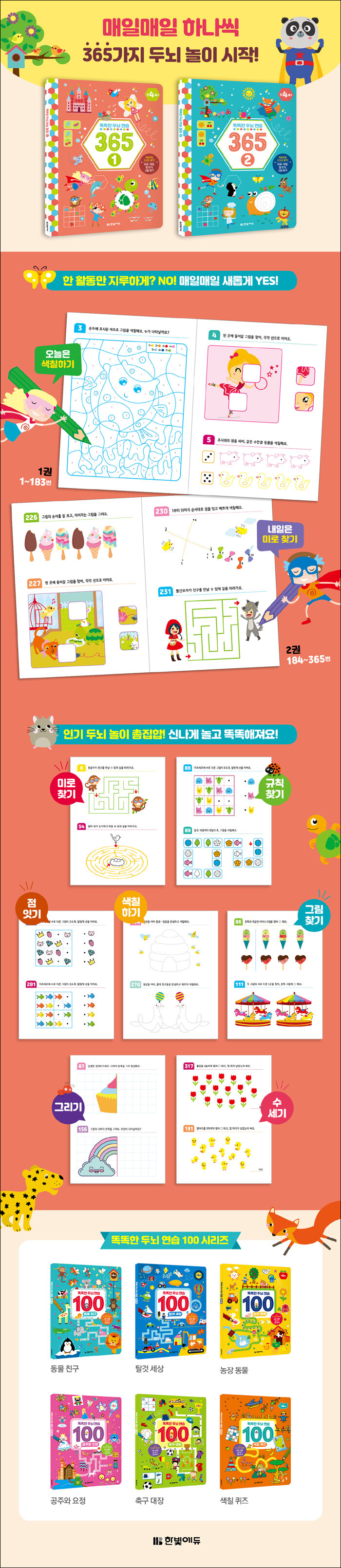 매일매일 하나씩 365가지 두뇌 놀이! '똑똑한 두뇌 연습 365' 시리즈'똑똑한 두뇌 연습 365'는 365가지 활동으로 구성된 두뇌 계발 워크북이에요. 아이들이 좋아하는 다양한 유형의 활동이 동물, 공룡, 공주 등의 재미난 그림과 함께 가득 들어 있지요. 하루에 하나씩 가볍게 놀이하다 보면 어느새 생각하는 힘이 쑥쑥 자랄 거예요.