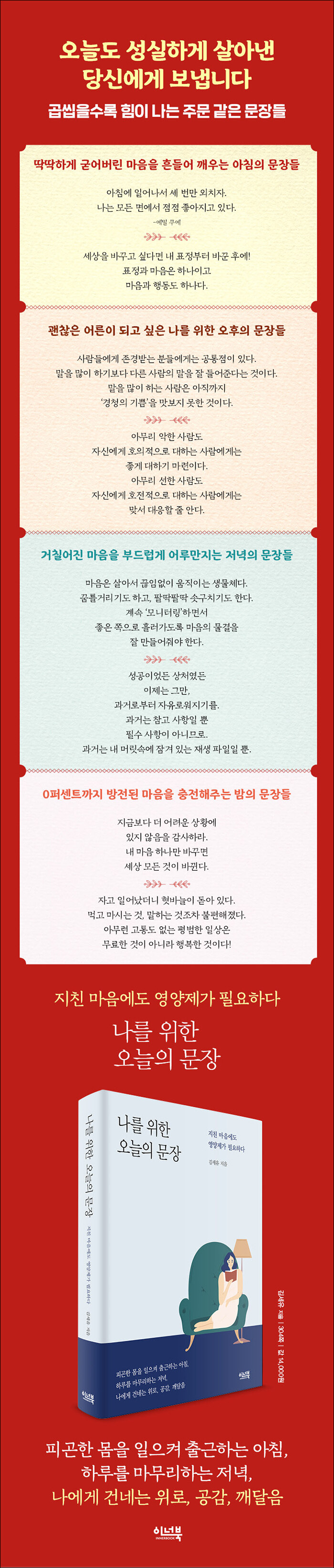 《나를 위한 오늘의 문장》에는 일에 치이고 사람에 치여 딱딱하고 거칠어진 마음을 여유와 절제, 부드러움이 가득한 마음으로 바꿔주는, 곱씹을수록 힘이 나는 주문 같은 문장들이 가득하다. 아침에 먹는 비타민처럼, 저녁에 먹는 초콜릿처럼 하나씩 읽어보면 마음이 한결 여유로워지고 또 하나의 ‘오늘’을 살아갈 힘을 충전할 수 있을 것이다.