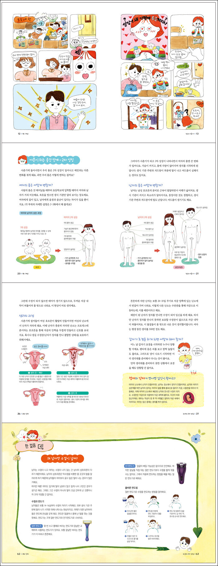 3화 도도는 오늘도 민수 생각 인체 : 소년의 2차 성징남자아이들의 몸도 자라면서 다양한 변화를 겪어요. 특히 사춘기 남자아이들은 사정과 몽정이라는 낯선 경험을 하게 되고, 더 나아가 자위를 시작하기도 해요. 목소리가 유난히 낮아지거나 불안정해지는 변성기도 오지요. 이러한 현상들에 대해 알아보고 주의할 점이 무엇인지 확인해요.