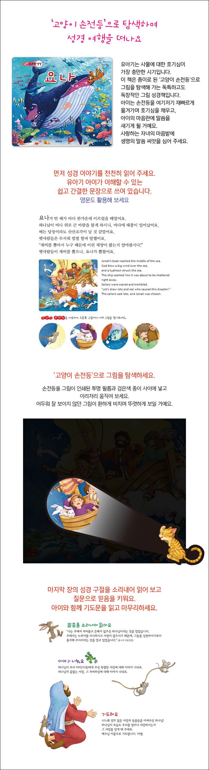 종이로 된 ‘고양이 손전등’으로 그림을 탐색해 가는 독특하고도 독창적인 그림 성경책입이다. 아이는 손전등을 여기저기 재빠르게 옮겨가며 호기심을 채우고, 아이의 마음판에 말씀을 새기게 될 것이다. 사랑하는 자녀의 마음밭에 생명의 말씀 씨앗을 심어 주자.