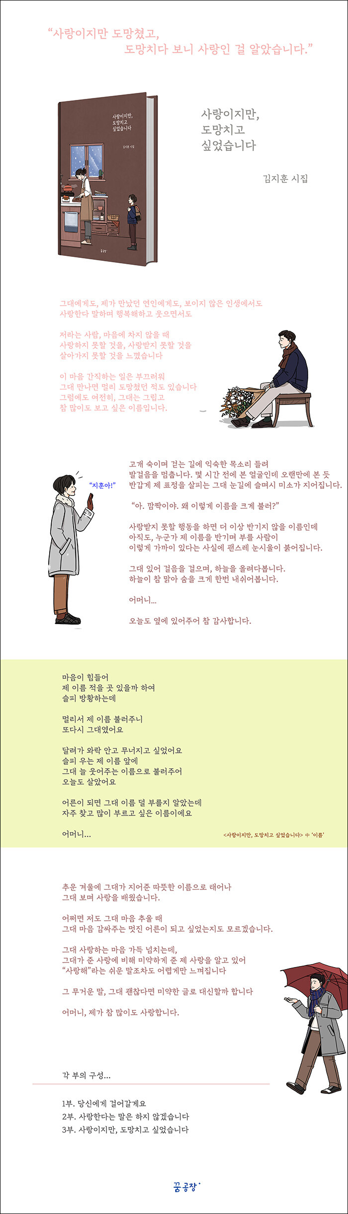 시집 <아버지도 나를 슬퍼했다>를 썼다.삶을 사랑할수록 작은 것들에 마음이 쓰이고더 많은 것들을 사랑하지 못하는 데서 오는 아픔도 쉽게 느낀다.사랑하고 싶지 않아서 혼자가 되는 게 아니라더 많이 사랑할 수 있는 사람이 되지 못할 것만 같아 혼자가 되기도 한다.가슴 밖으로 꺼낸 말에 누군가의 이상이 밝아졌는데그 마음에 빚진 마음이 들 때 멀리 도망치고 싶을 때가 있고실제로 그 마음은 자주 도망치곤 했다그럼에도 여전히 사랑하고 싶기에, 사랑하는 사람들의 언저리에 계속 머문다.