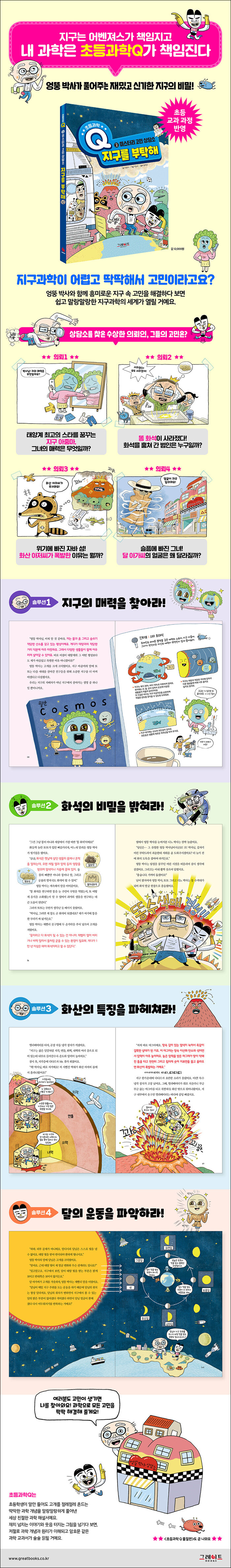 지구를 차근차근 살피며 세상을 보는 시야를 넓혀가요.지구에서 일어나는 자연 현상은 우리의 삶과 밀접한 관계가 있어요. 그래서 주변에서 일어나는 자연 현상에 관심을 갖고 제대로 이해하는 일은 매우 중요해요. 하지만 지구 과학은 그 범위가 워낙 광대해서 막상 어른들도 자연 현상의 원리를 이해하고 설명하기 막막할 때가 많아요. 게다가 학교에서 배우는 ‘지구 과학’은 아이들에게 너무 어렵고 지루한 암기 과목이 되버린지 오래지요. 이 책은 지구에 대한 과학적 지식과 개념을 기상천외한 캐릭터들의 고민을 통해 재미있고 쉽게 풀어내어 지구과학을 처음 접하거나 기초가 부족한 학생, 개념을 제대로 정리하고 싶은 모든 친구들에게 훌륭한 디딤돌이 되어줄 거예요.