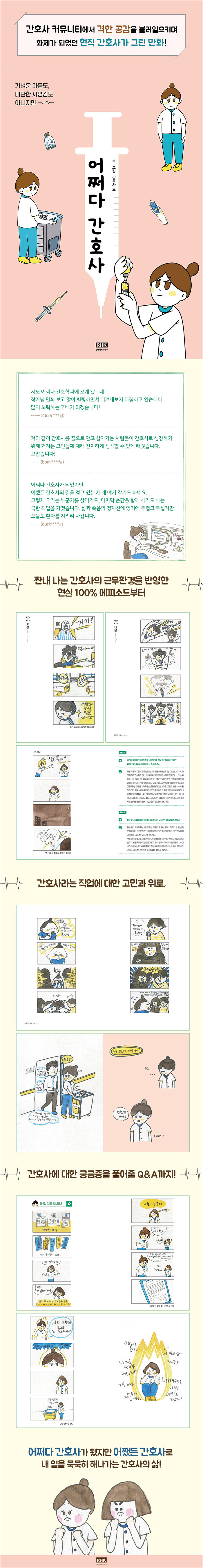 화제가 되었던 《어쩌다 간호사》 단행본 출간!드라마나 영화 속 꾸며진 모습이 아닌 리얼한 간호사의 일상을 그린 현직 간호사 웹툰이 간호사 커뮤니티에서 화제 된 바 있다. 시도 때도 없이 콜 벨을 눌러 분노케 만드는 할아버지 환자부터 잘해도 못해도 타박하는 선임 간호사, 초과 근무가 잦은 근무 환경 때문에 하루에도 몇 번씩 그만둘까 말까 고민하는 간호사의 시선이 만화에 실감나게 담겼다. 오늘 하루도 사람을 살리는 일에 힘쓰는 간호사들을 눈물짓게 하는 환자들의 이야기와 병원 곳곳에 숨겨진 위로들도 놓치지 않았다. 이렇듯 생생한 간호사의 이야기를 만화 뿐만 아니라 각 에피소드에 대한 작가의 단상과 Q&A로 구성해 새롭게 엮었다.