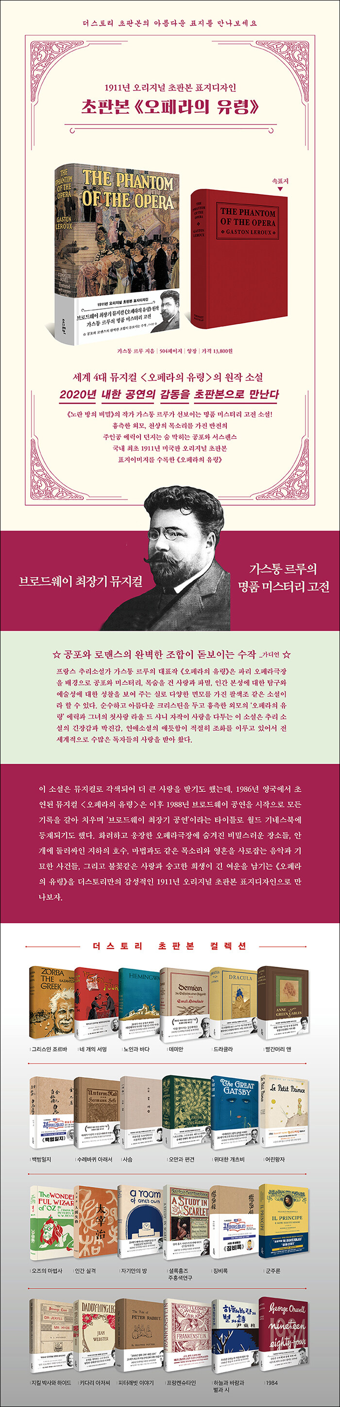 특히 이 소설은 뮤지컬로 각색되어 더 큰 사랑을 받기도 했는데, 1986년 영국에서 초연된 뮤지컬 <오페라의 유령>은 이후 1988년 브로드웨이 공연을 시작으로 모든 기록을 갈아 치우며 ‘브로드웨이 최장기 공연’이라는 타이틀로 월드 기네스북에 등재되기도 했다. 화려하고 웅장한 오페라극장에 숨겨진 비밀스러운 장소들, 안개에 둘러싸인 지하의 호수, 마법과도 같은 목소리와 영혼을 사로잡는 음악과 기묘한 사건들, 그리고 불꽃같은 사랑과 숭고한 희생이 긴 여운을 남기는 《오페라의 유령》을 더스토리만의 감성적인 1911년 오리지널 초판본 표지디자인으로 만나보자.