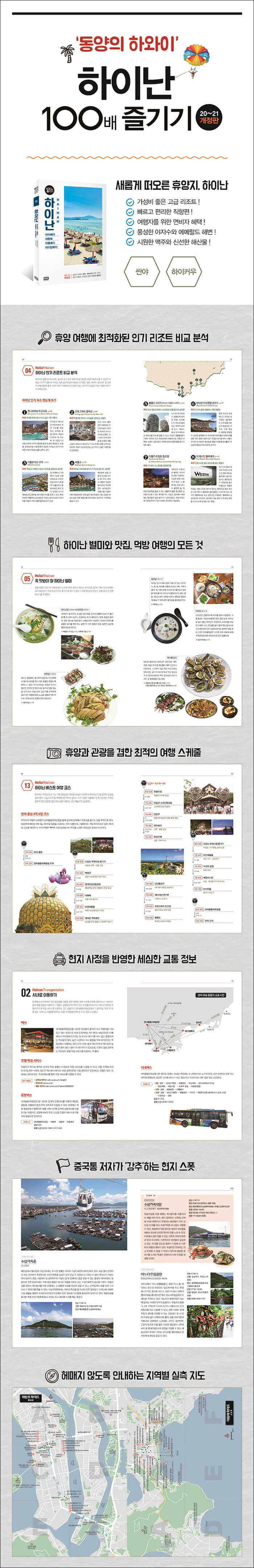 하이난 여행은 주로 리조트에 머물면서 관광지를 하나 둘쯤 골라 여행하는 패턴이라 이런 수요에 부응하면서 꼭 가봐야 할 스폿을 엄선해 최적화된 스케줄을 제안한다. 또한 하이난펀, 원창닭, 칭부량을 비롯한 각종 해산물 요리 등 하이난에서 꼭 맛봐야 할 별미, 술과 음료, 맛집까지 충실히 소개해 실패 없는 먹방 여행을 보장한다.