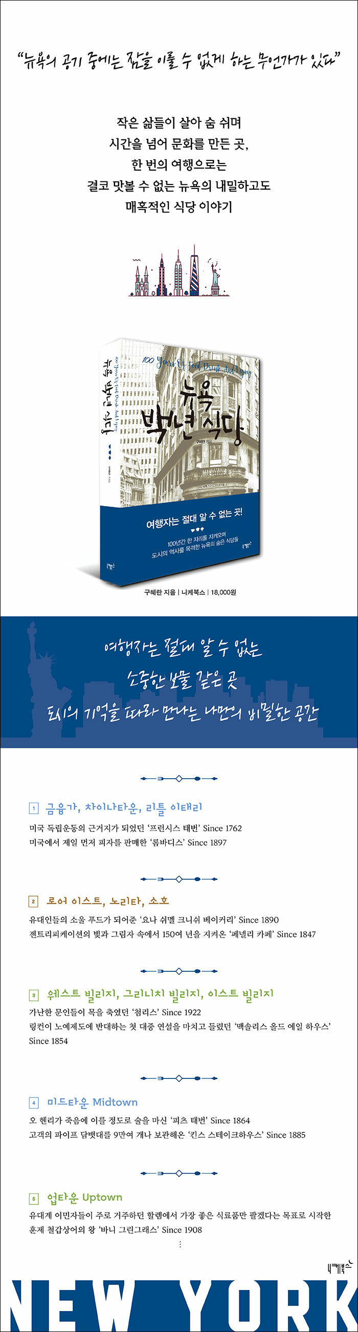 뉴욕이 ‘꿈과 희망의 도시’가 되기까지 그저 아름답고 낭만적인 도시였던 것은 아니다. 뉴욕에는 수백 년간의 숱한 고난의 역사가 서려 있고, 그 시간만큼 절절한 사연들이 골목골목 녹아 있다. 그중 역사의 소용돌이 속에서도 흔들리지 않고 한 자리를 지켜온 식당들, 《뉴욕 백년 식당》은 이처럼 백여 년간 같은 자리에서 도시의 역사를 목격한 식당으로 독자를 초대한다. 책에서 소개하는 총 스물아홉 곳의 백년 식당은 저자 구혜란이 공간과 시각의 미를 추구하는 디자이너로서, 뉴욕의 문화를 온몸으로 즐겨온 뉴요커로서 40여 년간 뉴욕의 거리를 걸으며 직접 발견해낸 숨은 보석 같은 곳이다. 식당마다 품고 있는 역사와 그곳에 얽힌 크고 작은 추억들은 그 어디에서도 찾아볼 수 없는 뉴욕의 깊은 맛을 느끼게 한다. 시간의 미감을 고스란히 담은 이야기와 현재를 생생하게 보여주는 식당 및 음식 사진도 풍성하게 수록되어 있어 뉴욕 백년 식당의 어제와 오늘을 비교해 보는 것도 흥미롭다. 역사가 오래된 식당들이 많은 로어 맨해튼에서부터 출발해 로어 이스트 사이드를 지나 그리니치 빌리지와 이스트 빌리지를 거쳐 미드타운과 업타운에 이르기까지 저자의 발걸음을 눈으로 따라가다 보면 독자는 어느새 뉴욕을 거니는 뉴요커가 되어 있을 것이다.