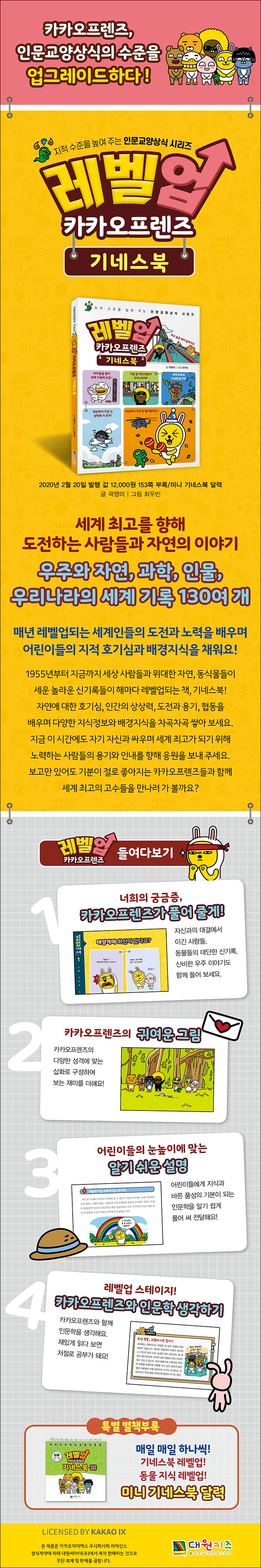재미있고 흥미롭게 알려주고 채워주는 책 기네스북은 ‘가장 빠른 새는 무엇일까?’라는 한 사람의 궁금증에서 시작하여 1955년부터 현재까지 사람과 자연의 위대한 도전과 호기심을 기록해온 책이에요. 그 속에는 우주와 자연, 과학, 인문, 스포츠, 예술 등의 분야에서 최고 기록으로 인정된 신기록들로 가득하지요. 《레벨업 카카오프렌즈 기네스북》은 초등학생들의 지적 호기심과 창의력에 도움이 되는 우주와 자연, 과학, 인물, 우리나라를 주제로 130여 개의 기발하고 대단한 기록들을 담았어요.