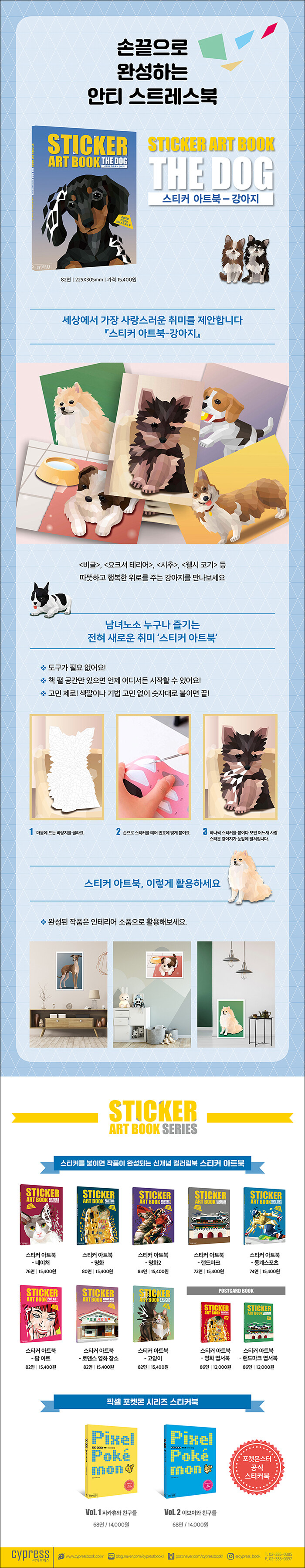 번호에 맞는 스티커를 붙여 나만의 작품을 완성하는『스티커 아트북』시리즈의 아홉 번째 책『스티커 아트북-강아지』편이 출간됐다.『스티커 아트북-강아지』에서는 세계에서 가장 빠른 개 <그레이 하운드>, 낮은 코, 짧은 앞다리 등 특징 있는 생김새와 뛰어난 친화력으로 사랑받는 대표 반려견 <프렌치 불도그>, 어린이들의 친구 스누피의 모델로 유명한 <비글>, 움직이는 보석이라고 불리는 <요크셔 테리어>, 아이슬란드의 썰매 개가 조상인 <포메라니안>, 오소리 사냥개로 활약했던 <닥스훈트>, 사자 갈기처럼 늘어진 털로 큰 사랑을 받는 <시추>, 짧은 다리와 씰룩거리는 엉덩이가 귀여운 <웰시 코기>, 충성심 강한 우리나라 특산종 <진돗개>, 세계에서 가장 작은 강아지 <치와와>까지 사람들에게 많은 사랑을 받는 대표 강아지 10종을 소개한다. 존재만으로 우리에게 따뜻하고 행복한 위로를 주는 강아지의 모습을 직접 완성해보자.