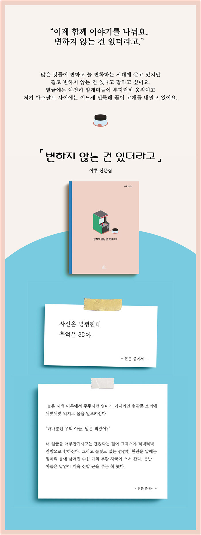 저는 오래된 것들을 보고 찾고 모으는 것들을 굉장히 좋아합니다.타자기, 재봉틀, LP, 괘종시계 등 오래된 옛 물건들을 바라보면 느껴지는 귀여움과 가슴 따뜻했던 추억들이 마구마구 샘솟기 때문입니다. 그래서 그런 것들을 보고 듣고 말할 때면 언제나 눈이 말똥말똥, 매일매일 항상 그런 것들에 빠져 살고 있습니다.그러다 보니 여기까지 오게 되었습니다. 살아가면서 따듯한 미소와 포근한 마음을 느꼈던 잊고 있고 가까운 이야기들을 함께 느끼고 있었습니다. 그렇게 2018년, ‘미지근한 이야기’라는 책을 내가 되었고 지금은 ‘변하지 않는 건 있더라고’ 를 말하게 되었습니다. @kimyaru