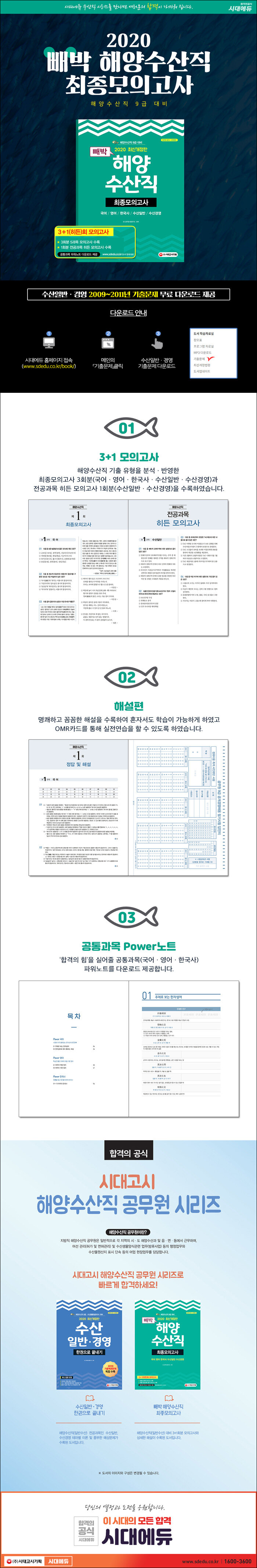 해양수산직 9급 시험 기출 유형을 꼼꼼하게 분석.반영한 최종모의고사 3회분(국어.영어.한국사.수산일반.수산경영)을 수록하였다. 전공과목인 수산일반과 수산경영의 2과목으로 구성된 전공과목 히든 모의고사(1회분)를 수록하였다. 실전에 보다 확실하게 대비할 수 있도록 실제 시험과 동일하게 2단으로 구성하였다. 명쾌하고 꼼꼼한 해설을 수록하여 혼자서도 학습이 가능하게 하였고 OMR 카드를 통해 실전연습을 할 수 있도록 하였다. ‘합격의 힘’을 실어줄 공통과목(국어.영어.한국사) 파워노트를 다운로드 제공한다.