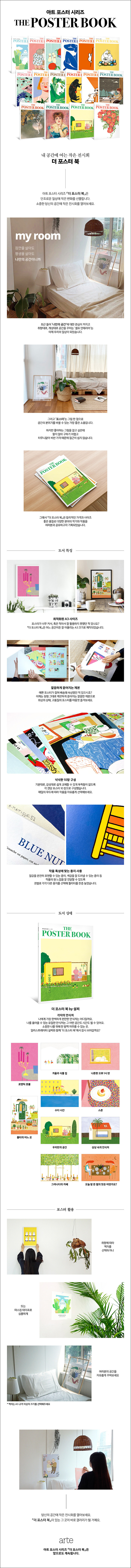 잠깐을 살아도 평생을 살아도 내 공간이니까우리는 살면서 반 이상의 시간을 집 또는 개인의 공간에서 보냅니다. 오롯이 내가 쓰고, 내가 꾸미는 그 공간은 삶의 감정을 그대로 담아내 변화도 많고 그만큼 애착도 가득하지요. 그 특별한 공간을 좋아하는 만큼 취향에 맞는 소품으로 채워 세상에서 가장 사랑스러운 장소로 만들어보는 건 어떨까요? 『더 포스터 북』은 여러분의 곁에 두고 평생을 함께할 가장 좋은 소품입니다. 『더 포스터 북』 속 좋아하는 작가, 그리고 다양한 포스터 작품을 매일의 감성대로 꾸며 여러분의 공간에 작은 전시회를 열어보세요. 그리고 그 공간을 사랑해주세요. 잠깐을 살아도 평생을 살아도 하나뿐인 내 공간이니까요.