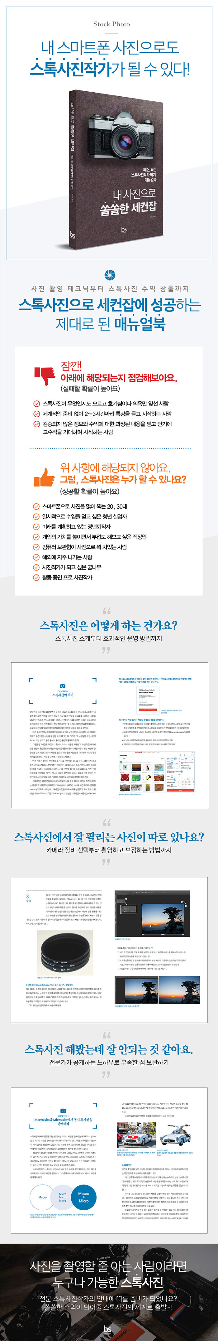 스톡사진으로 세컨잡에 성공하는 제대로된 매뉴얼북나 혼자 찍고 감탄했던 스마트폰 속 사진들, 인스타그램에 올리고 '좋아요'만 기대했던 사진들, 컴퓨터 보관함에 보관되어 있는 수많은 사진들… 이 사진들을 스톡에 올려보는 건 어떨까? 온라인 시장이 발전하고 고성능 카메라가 대중화되면서 바야흐로 사진으로 돈 버는 시대가 됐다. 프로 사진작가가 아닌 일반인도 스톡사진작가가 되어 수익을 창출할 수 있게 된 것이다.