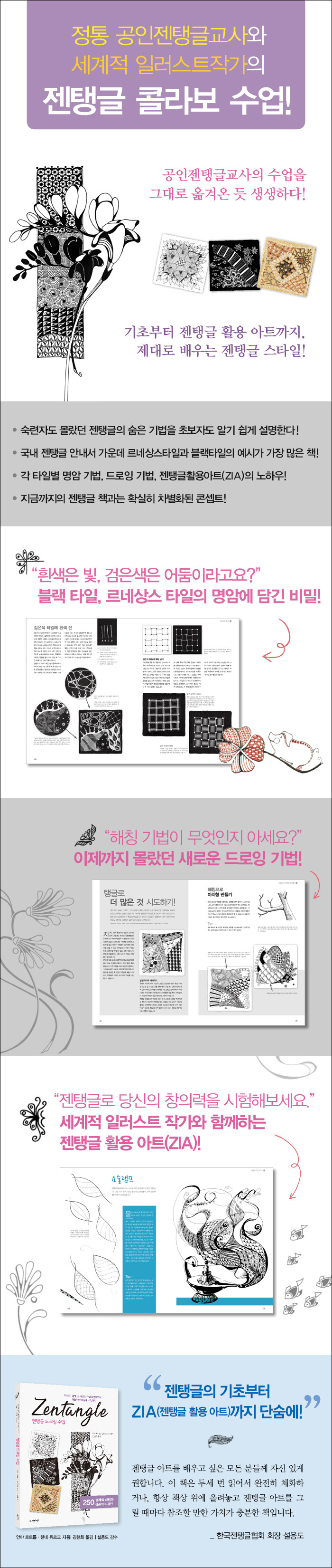 젠탱글 관련 도서 가운데 매우 독특한 콘셉트의 책이다. 공인젠탱글교사(CZT)와 세계적 일러스트 작가가 함께 책을 집필한 것이다. 다른 책보다 핵심적인 젠탱글 기법이 일목요연하게 정리되어 있고, 젠탱글 패턴을 그리는 방법과 유의점이 자세히 설명되어 있다. 책의 많은 분량을 할애해 블랙 타일과 르네상스 타일 활용법을 소개하고 있을 뿐만 아니라, 명암 기법이나 해칭 기법에 대한 친절한 설명도 이 책만의 특징이다.
