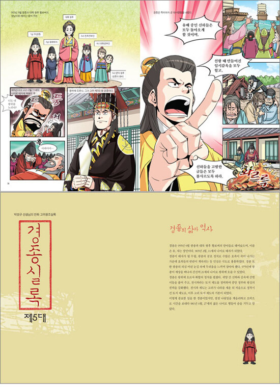 고려에 대한 방대한 자료와 고증을 바탕으로 하여, 올바른 역사관과 역사 지식을 만화라는 형식을 통해 어린이들에게 쉽고, 재미있게 전달해주기 위해 만들어진 <박영규 선생님의 만화 고려왕조실록> 시리즈. 두 번째 권인 이 책에서는 고려의 제5대 왕 경종에서부터 제8대 현종까지의 이야기를 다루고 있다.