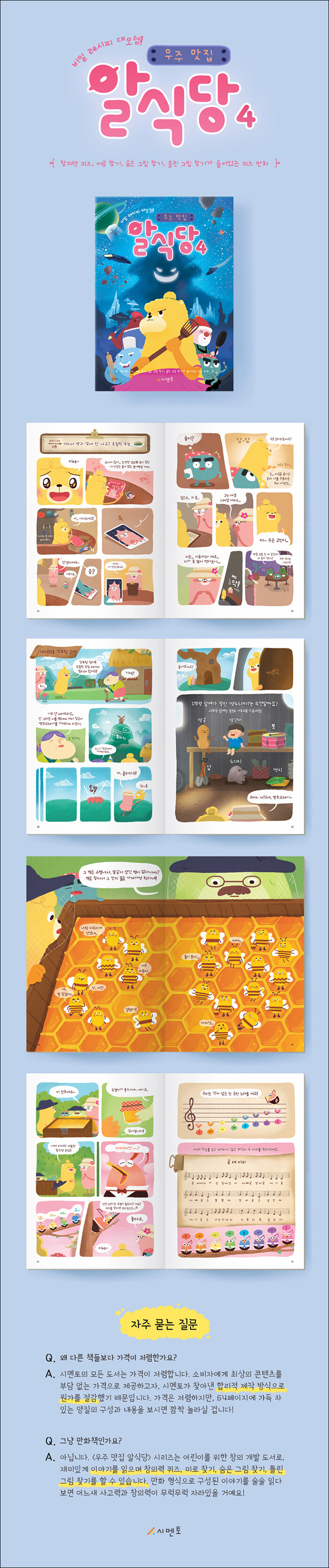 <우주 맛집 알식당> 시리즈는 단순한 만화가 아니다. 어린이를 위한 창작 동화를 쉽게 읽을 수 있도록 만화 형식으로 개발한 스토리북으로, 이야기를 읽으며 창의력 퀴즈, 미로 찾기, 숨은 그림 찾기, 틀린 그림 찾기 등 상상력 넘치는 문제들을 풀게 된다. 어른들이 읽어도 재미있는 이야기가 가득한 시멘토의 신간도서 <우주 맛집 알식당>은 요리사 알렉스와 그의 조수인 짱돌의 이야기가 흥미롭게 펼쳐지는 내용으로 구성되어 있다. 책 이름만 보면, 마치 요리/맛집 등에 관한 책일 것 같지만, 비밀 엘리베이터가 등장하고 숨겨진 우주선이 등장하는 등 스토리의 웅장한 스케일에 놀랄만한 책이다. 책 내용뿐만 아니라, 그림의 섬세한 디테일과 표현력의 깊이에 감동받을 책으로 <우주 맛집 알식당> 시리즈는 어린이들에게 평생의 즐거운 추억이 될 것이다.