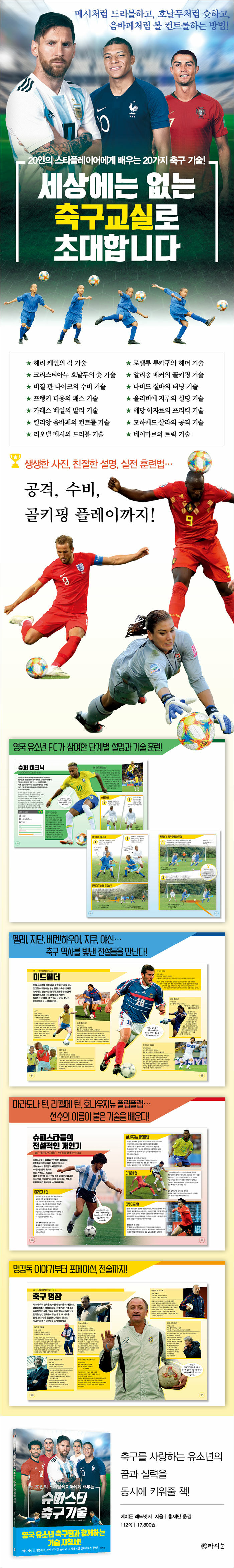 이처럼 유소년을 중심으로 한 축구 열기는 뜨겁지만 정작 그들을 위한 축구 교재 혹은 축구 기술서는 찾기 어려웠는데, 드디어 축구를 사랑하는 유소년이라면 꼭 소장해야 할 책이 출간되었다. 영국에서 출간된 이 책은 현존하는 세계 최고의 스타플레이어들이 등장해 각 분야별로 축구 기술을 알려준다. 드리블은 메시에게, 슛은 호날두에게, 컨트롤은 음바페에게, 수비는 판 다이크에게 배우는 식이다.