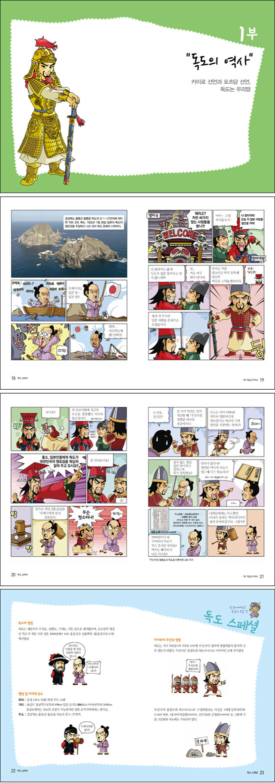 독도의 모든 것을 한 권의 만화로 만날 수 있다!2011년 2학기부터 초등학교는 독도 수업을 개설했으며, 중학교와 고등학교 역시 2012년부터 연 8~10시간의 독도 수업을 받아야 한다. 이제까지 국어, 사회, 국사의 곁다리로 배우던 독도를 단독 과목으로 개설한 것은 최근 일본의 독도 왜곡 교과서 채택에 맞서 우리나라 역시 독도에 대한 체계적인 교육이 필요하다는 판단 때문일 것이다.