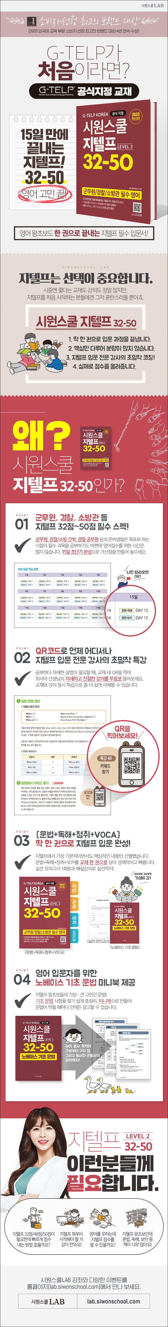 1. 군무원 9급, 경찰/소방 간부, 경찰 공무원 등 시험 대비 지텔프 32점~50점 목표 달성군무원 9급을 준비하는 수험생은 지텔프 32점 이상을 받아야 하며, 경찰 공무원 준비생은 지텔프 48점 이상일 경우 가산점을 받으며, 경찰/소방 간부 준비생은 지텔프 50점이 필요합니다. 목표로 하는 시험의 필수 과목 국어, 국사, 행정법 등 공부하기도 바쁜 고시생에게 영어 점수를 위해 할애할 수 있는 시간은 많지 않습니다. 빠르고 효율적으로 목표 점수를 달성하여 필수 과목을 공부해야 하기 때문에 『시원스쿨 지텔프 32-50』은 딱 한 권으로 15일만에 목표 점수를 달성할 수 있도록 구성되어 있습니다