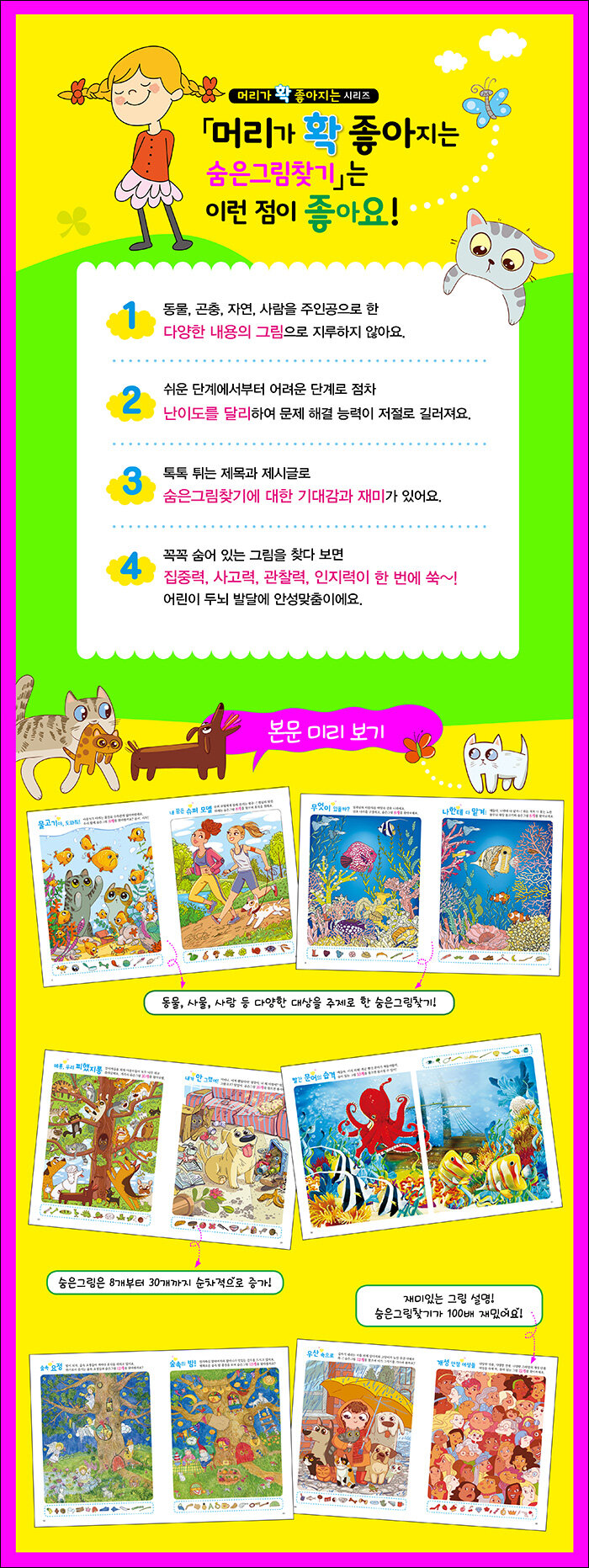 머리가 확 좋아지는 시리즈. 동물, 곤충, 자연, 사람을 주인공으로 한 다양한 내용의 그림으로 지루하지 않다. 쉬운 단계에서부터 어려운 단계로 점차 난이도를 달리하여 문제 해결 능력이 저절로 길러진다. 톡톡 튀는 제목과 제시글로 숨은그림찾기에 대한 기대감과 재미가 있다. 꼭꼭 숨어 있는 그림을 찾다 보면 집중력, 사고력, 관찰력, 인지력이 한 번에 자라난다.