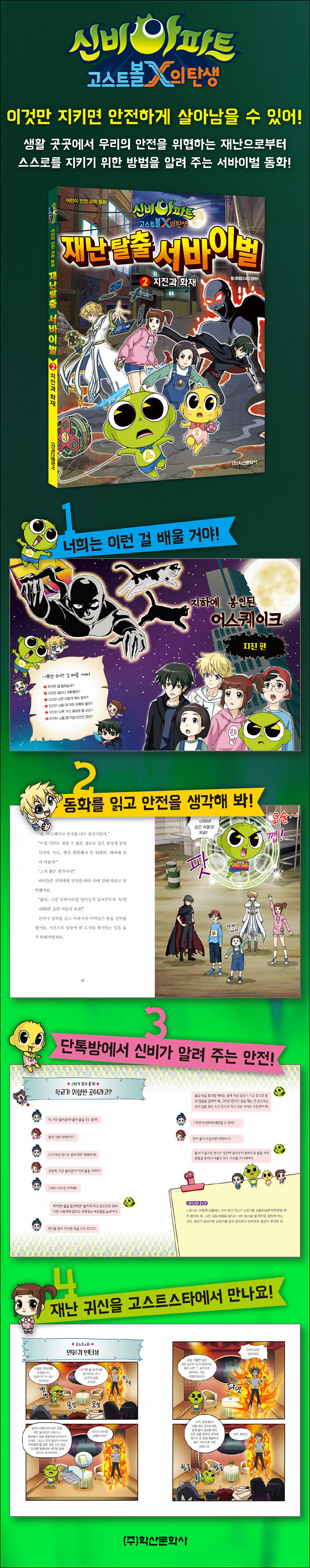 이것만 지키면 안전하게 살아남을 수 있어!《신비아파트 고스트볼 X의 탄생 재난 탈출 서바이벌 2 지진과 화재》에는 주변 곳곳에 숨어서 우리의 안전을 위협하는 귀신들이 등장해요. 봉인 상자 안에 갇혔다 풀려나 지진을 일으키는 악귀 어스퀘이크와 불과 연기로 사람들을 공격하는 연화귀예요.